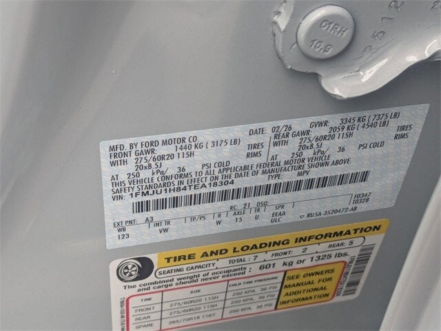 Equipment Group 202A Touring Package (2nd Row Power-Folding Captain's Chairs, 3.31 Axle Ratio, 360-Degree Zone Lighting, 3rd Row Vinyl Seats, 4-Door Intelligent Access (Lock/Unlock), 4-Way Manual Head Restraints, Active Air Dam, ActiveX-Trimmed Front Heated Captain's Chairs, Dual Power-Folding Sideview Mirrors with Autofold, Flex Powered Console, Ford Digital Experience, Ford Split Gate, Front Side Laminated Glass, Heated Steering Wheel, Memory Driver Seat, Power Tilt/Telescopic Steering Wheel with Memory, Pro Power Onboard - 400W, Radio: AM/FM Stereo with MP3 Capable, Rain Sensitive Windshield Wipers, SiriusXM with 360L, USB Ports, and Wheels: 18 x 8.5 Dark Alloy Painted Aluminum), Ford Connectivity Package (1-Year Included), 3rd row seats: split-bench, 4-Wheel Disc Brakes, 6 Speakers, ABS brakes, Air Conditioning, Alloy wheels, AM/FM radio: SiriusXM with 360L, Apple CarPlay/Android Auto, Auto High-beam Headlights, Auto-dimming Rear-View mirror, Automatic temperature control, Brake assist, Bumpers: body-color, Cloth Front Captain's Chairs, Compass, Delay-off headlights, Driver door bin, Driver vanity mirror, Dual front impact airbags, Dual front side impact airbags, Electronic Stability Control, Emergency communication system: 911 Assist, Exterior Parking Camera Rear, Four wheel independent suspension, Front and 2nd Rows Floor Liners (tray Style), Front anti-roll bar, Front Bucket Seats, Front Center Armrest, Front dual zone A/C, Front License Plate Bracket, Front reading lights, Fully automatic headlights, Heated door mirrors, Illuminated entry, Intersection Assist, Low tire pressure warning, Navigation System, Occupant sensing airbag, Outside temperature display, Overhead airbag, Overhead console, Panic alarm, Passenger door bin, Passenger vanity mirror, Power door mirrors, Power driver seat, Power passenger seat, Power steering, Power windows, Radio data system, Rear air conditioning, Rear anti-roll bar, Rear reading lights, Rear window defroster, Rear window wiper, Reclining 3rd row seat, Remote keyless entry, Security system, Speed control, Speed-sensing steering, Speed-Sensitive Wipers, Split folding rear seat, Spoiler, Steering wheel mounted audio controls, Tachometer, Telescoping steering wheel, Tilt steering wheel, Traction control, Trip computer, Variably intermittent wipers, Voltmeter, and Wheels: 20 x 8.5 Bright Machined Aluminum.