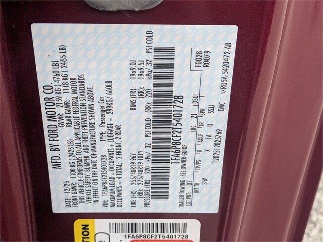 Equipment Group 400A Standard Package (AM/FM Stereo, SYNC 4, and Wheels: 19 x 8.5 Shadow Silver-Painted Aluminum), Ford Co-Pilot360 Assist+, GT Performance Package (Black Painted Strut-Tower Brace), 1st Row Carpeted Black Floor Mats, 4-Wheel Disc Brakes, ABS brakes, Active Valve Performance Exhaust, Air Conditioning, Alloy wheels, Auto High-beam Headlights, Automatic temperature control, B&O Sound System by Bang & Olufsen with 12 Speakers, Brake assist, Bumpers: body-color, Compass, Delay-off headlights, Driver door bin, Driver vanity mirror, Dual front impact airbags, Dual front side impact airbags, Electronic Stability Control, Emergency communication system: 911 Assist, Exterior Parking Camera Rear, Four wheel independent suspension, Front anti-roll bar, Front Bucket Seats, Front Center Armrest, Front dual zone A/C, Front reading lights, Fully automatic headlights, Illuminated entry, Knee airbag, Leather Shift Knob, Leather steering wheel, Low tire pressure warning, Occupant sensing airbag, Outside temperature display, Overhead airbag, Overhead console, Panic alarm, Passenger door bin, Passenger vanity mirror, Power door mirrors, Power steering, Power windows, Radio data system, Rain sensing wipers, Rear anti-roll bar, Rear Parking Sensors, Rear window defroster, Remote keyless entry, Speed control, Speed-sensing steering, Speed-Sensitive Wipers, Split folding rear seat, Sport steering wheel, Steering wheel mounted audio controls, Tachometer, Telescoping steering wheel, Tilt steering wheel, Traction control, Trip computer, Variably intermittent wipers, and Voltmeter. Price includes: $1000 - Retail Customer Cash. Exp. 03/31/2026